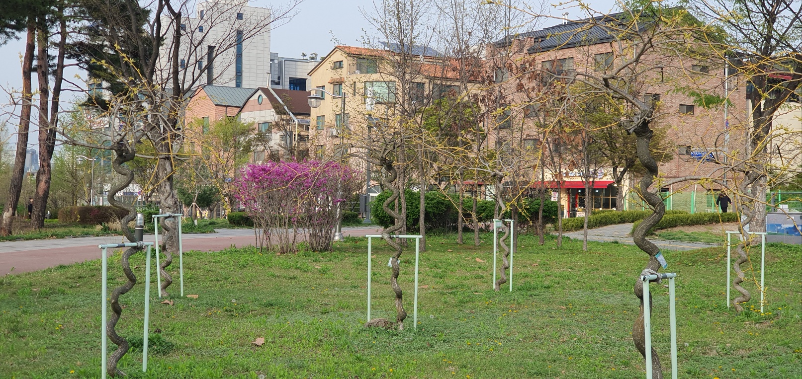 금곡동 홈플러스 뒤로 돌아가면 금곡천 어울림 공원이 나온다 공원 입구에 자리잡고 있는 이꽃나무의 이름은 박태기 나무라고 한다. 콩과의 낙엽 활엽 관목인데 봄에 붉은 꽃이 핀다. 가지가 뱀처럼 꼬여 자라는 특징이 있다. 꽃말은 우정, 행복이라고 한다.