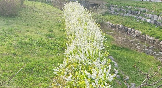하얀색꽃으로 가지런히 자란 조팝나무를 보면 싱그럽다. 높이 1미터 정도의 키에 금곡천 변으로 줄지어 핀 조팝나무는 어린순은 나물로 하고 뿌리는 해열,수렴 등의 효능이 있어 감기로 인한 열, 신경통 등에 사용한다.