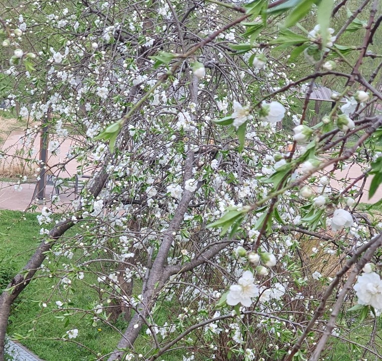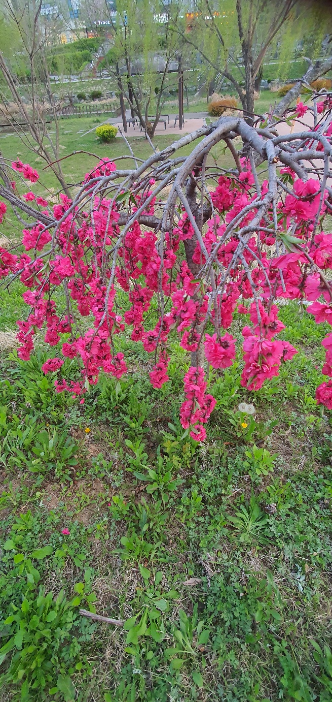 키가 아담하게 자란 수양홍도화는 가지가 땅을 보고 늘어져서 가지에 다닥다닥 꽃을 피우는데 붉은색이 너무 매혹적이어서 자리를 떠나지 않고 한참을 바라보았다.